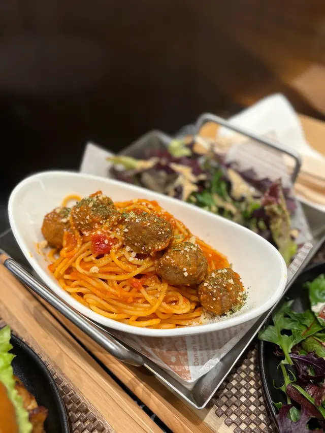 ▫️自家製蕃茄醬炒意粉配肉丸配雜菜沙律 $98