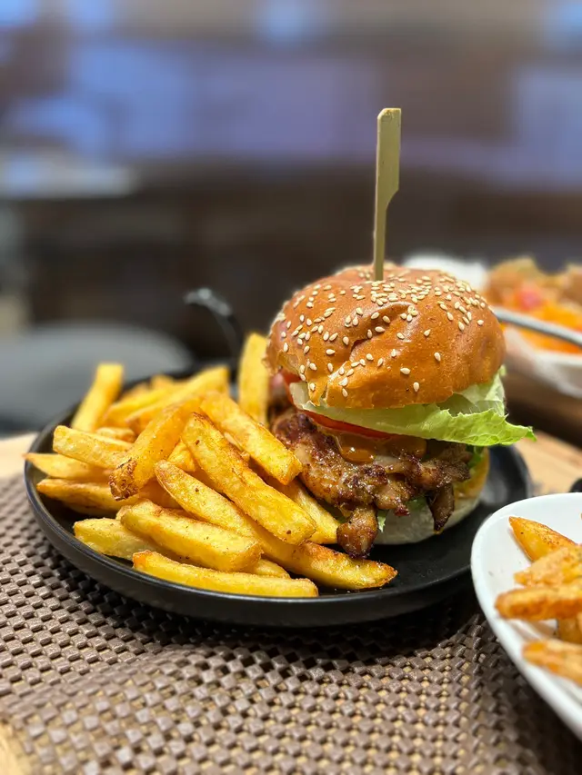 🍔 口水雞扒係signature,雞肉肉汁、麻辣口水汁,配埋生菜番茄好fresh冇得彈!預設跟雜菜沙律,轉炸薯條 $22 點口水汁又係世一 🤤