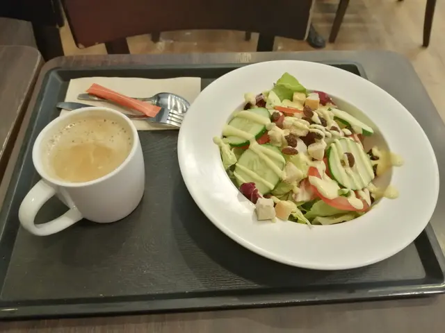 田園沙律顏色健康,材料新鮮,有牛油生菜、新鮮蕃茄、青瓜、提子乾、麵包粒、紫椰菜....