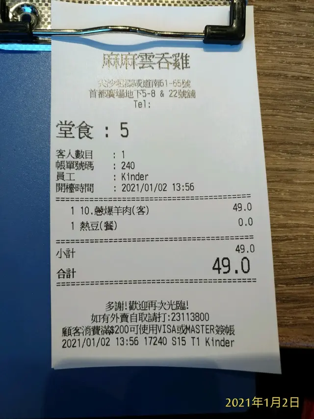 造福白领的午餐馆 yaukevin等级22021-01-02943 浏览 关注 放假无事,下午逛街见有礼貌青年站岗招徕,原来是推广<嫲嫲云呑鸡>,本来未感肚饿的我立刻~食欲大增,坐下点菜才知招牌<云呑鸡>要16:00才出炉,虽然大失所望~但见店员十分有礼,本着既来之则安之的心态下改点客饭<葱爆羊肉>$49送豆浆,委买比连锁快餐店的<家常小菜>饭价便宜。看卖相不差,羊肉软而骚味不强烈,像鹿肉多,味道十分可口。见菜单有多款客饭午餐供应,看来附近商业区工作的白领有福了。本人改天晚上再试<云呑鸡,>可也。以上食记乃用户个人意见 , 并不代表OpenRice之观点。赞好分享造福白领的午餐馆 嫲嫲雲吞雞 (首都廣場) https://s.openrice.com/QrLT0IPKx00检举 张贴 评分4味道4环境5服务4卫生4抵食用餐日期2021-01-02用餐途径堂食人均消费$49 (午餐)