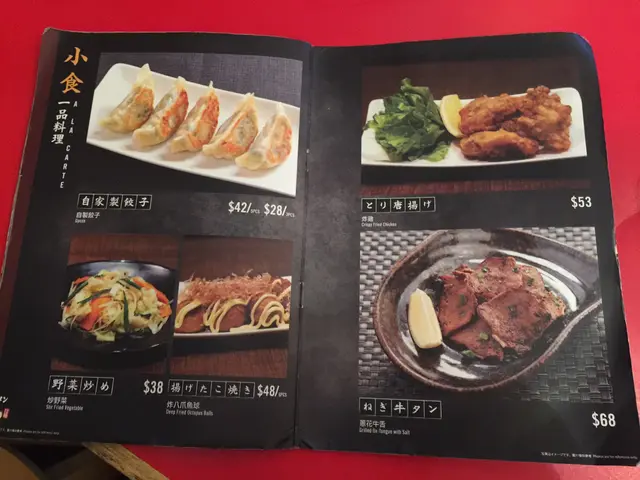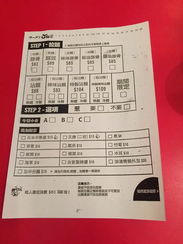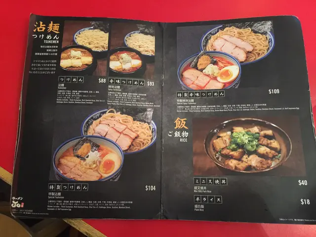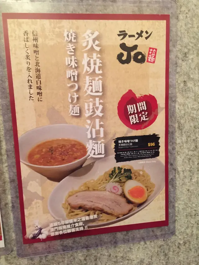 沾麵有熱麵和冷麵兩種選擇,沾麵的配料包括極粗麵、濃厚木魚豚骨湯、叉燒三片、椰菜、玉蔥、京蔥、干荀、木魚粉、紫菜和半隻半熟蛋。