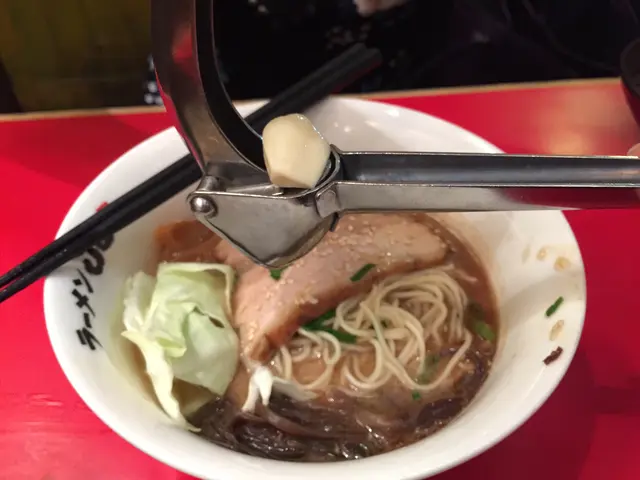 如果想再增添蒜味,還可以用蒜頭夾把原粒生蒜頭壓碎,新鮮壓成的蒜蓉味道帶點辛香,亦令拉麵味道更添層次。