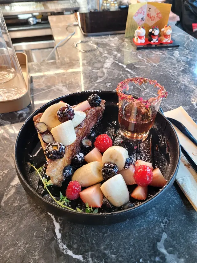 因為係輕盈版本,法式吐司得1件(如果叫正常版本嘅話會有3件),然後側邊有雜莓、香蕉。同埋有楓糖醬可以自己淋,不過我覺得本身都夠甜所以無特別再額外加。佢嘅法式吐司係外脆內軟,裡面屬於比較偏淋身嘅口感,蛋香味都好重。而且欣賞佢食落會有肉桂嘅香味,平時喺其他地方好少會食到肉桂味嘅French toast,適合中意肉桂嘅朋友。