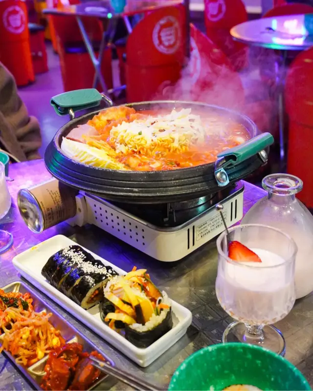 我哋食左韓國餐必食嘅邪惡部隊鍋🍜,入面有芝士拉絲拉麵,同埋魚榚、年糕,腩肉等等,味道正正常常,勝在有個爐烘住食,熱辣辣!仲有辣豬肉紫菜飯卷,好足料,舊舊爆餡!