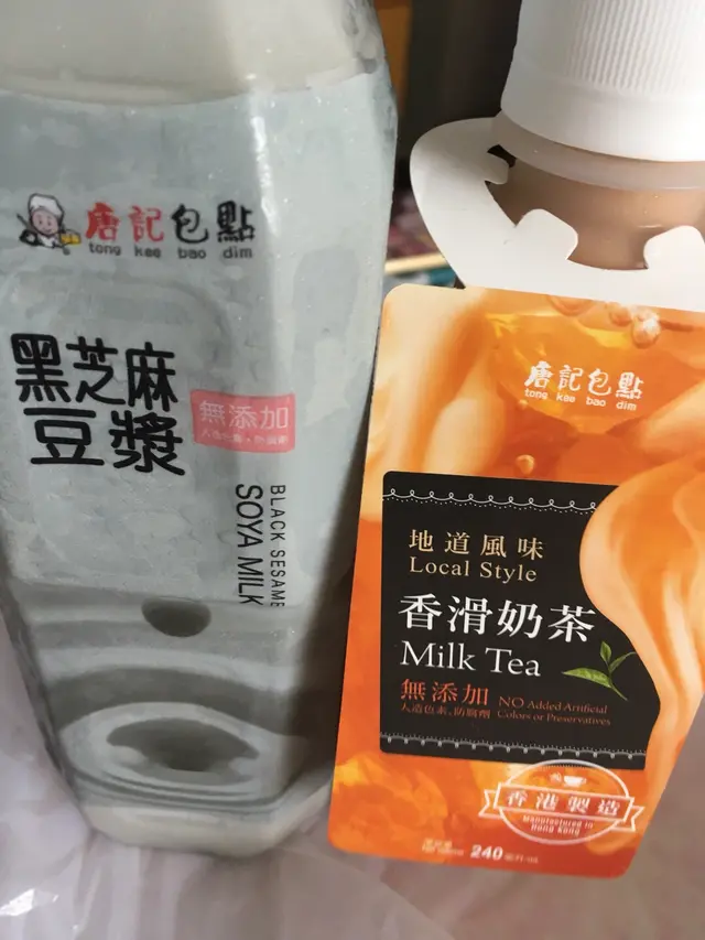 奶茶 HKD 12 、 黑芝麻豆漿 HKD 9