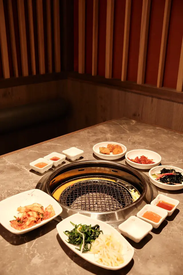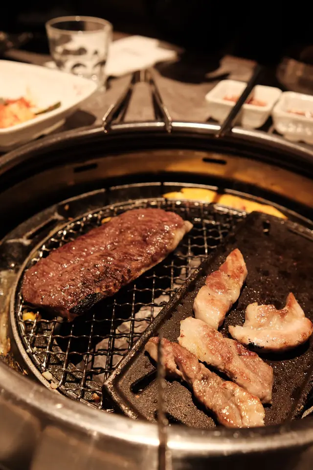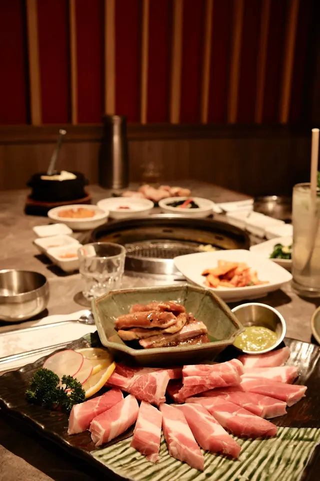 侍應就好快送上七款韓式小菜,全部都好開胃!我哋叫咗個「一級五花肉梅花肉拼盤」,啲五花肉厚切大條,油脂分布平均,燒到金黃色嗰陣真係好香🤤 食落外脆內嫩,肉汁豐富!