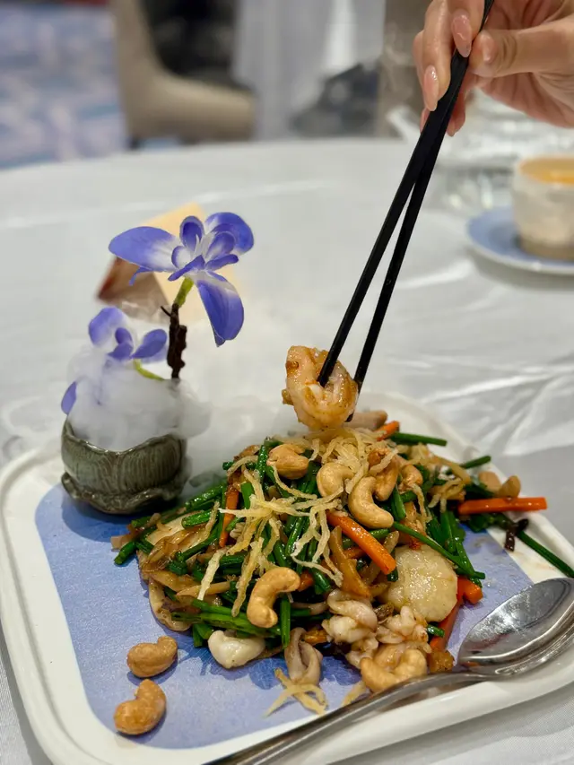 主菜方面,我哋點咗香芒脆蝦球同香馥小炒皇。香芒脆蝦球係我今晚最鍾意嘅一道菜!啲蝦球外面係炸到金黃嘅脆皮,咬落好香脆,入面嘅蝦肉好彈牙,搭配埋芒果醬同黑芝麻,甜甜鹹鹹嘅味道好夾,食完一啲都唔膩。香馥小炒皇就係一碟炒雜菜,入面有蝦仁、帶子、腰果同好多新鮮蔬菜,炒得啱啱好,菜保持到爽脆嘅口感,調味好清淡但好香,腰果仲增加咗啲口感,成碟菜食落好健康又滿足。