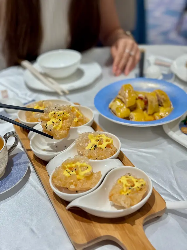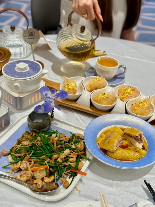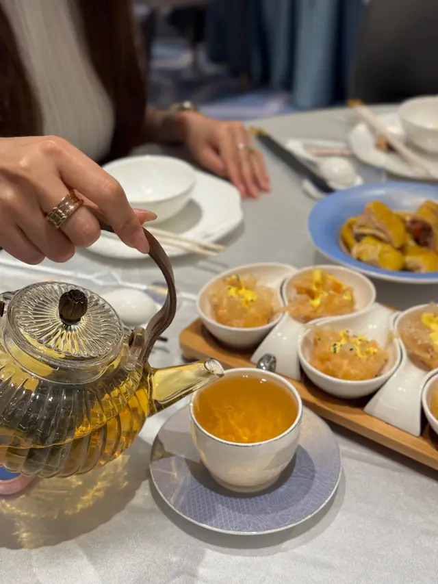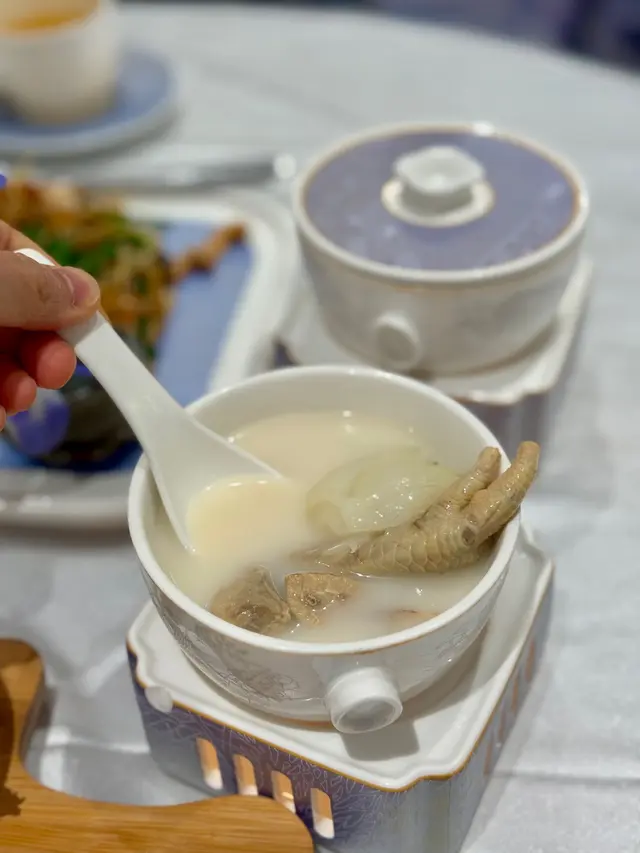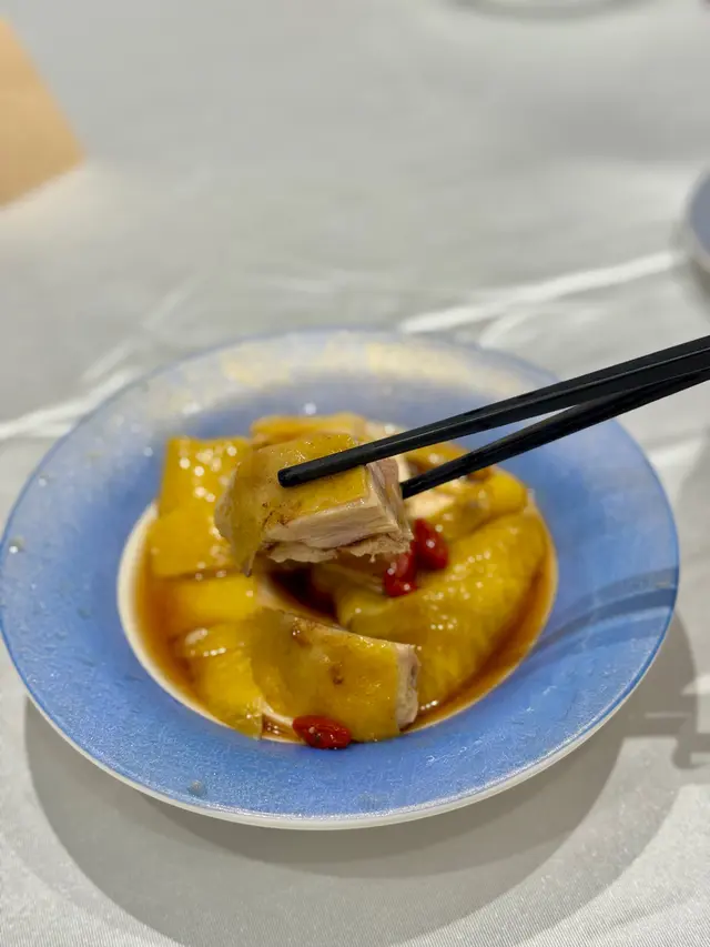 一入座,服務員就拎咗一壺熱茶過來,茶壺係透明嘅,可以見到啲茶葉喺入面慢慢散開,飲落好清新,暖笠笠咁好舒服。我哋叫咗幾款菜式,先講啲小食,佢哋嘅杞子花雕醉雞真係好正!醉雞肉質好嫩,啖啖都滲咗花雕酒嘅香氣,杞子仲帶少少甜味,食落好開胃,份量都啱啱好,兩個人分一小份真係啱晒。跟住我哋叫咗兩碗杏汁菜膽燉白肺湯,呢個湯真係好驚喜!湯底好濃郁,杏汁嘅甜味同菜膽嘅清新好平衡,白肺燉得好腍,入口即化,飲完成個人都暖晒,特別係而家天氣少少涼,飲呢啲湯真係好滋補。