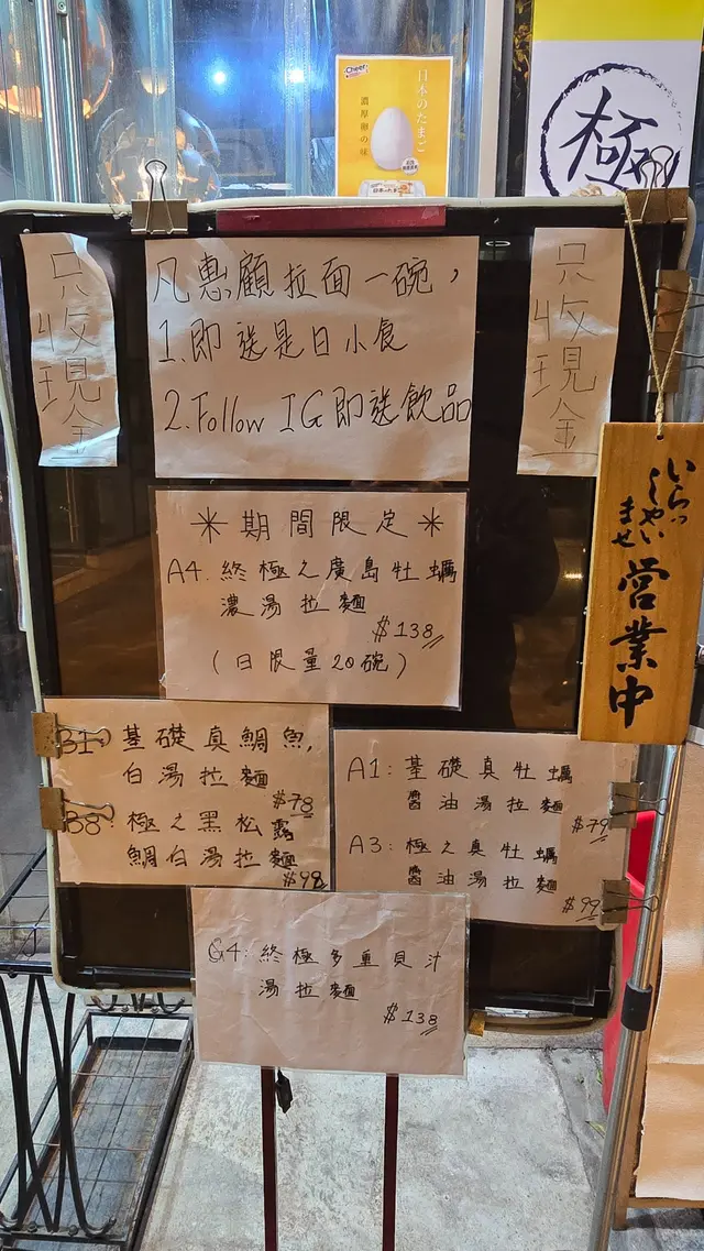 我叫左A4.終極之廣島牡蠣濃湯拉麵,細佬就揀B8.極之黑松露鯛白湯拉麵,小食叫左雞皮餃子,叫拉麵有送甜品,Follow佢地IG送飲品!