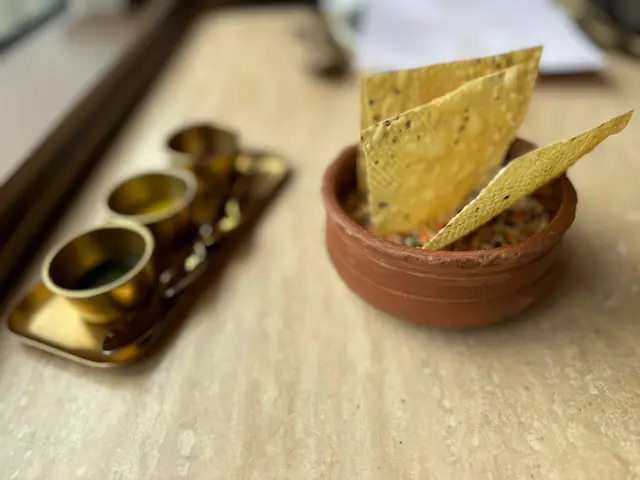這道充滿印度街頭小吃靈魂的Chilli chaat,以Shishito燈籠椒為主角,搭配靈魂dressing:優格薄荷羅望子調製的優格酸甜開胃,加入軟綿的芝士、酥脆的黃金薯粒,創造風味,極具特色,好吃!
