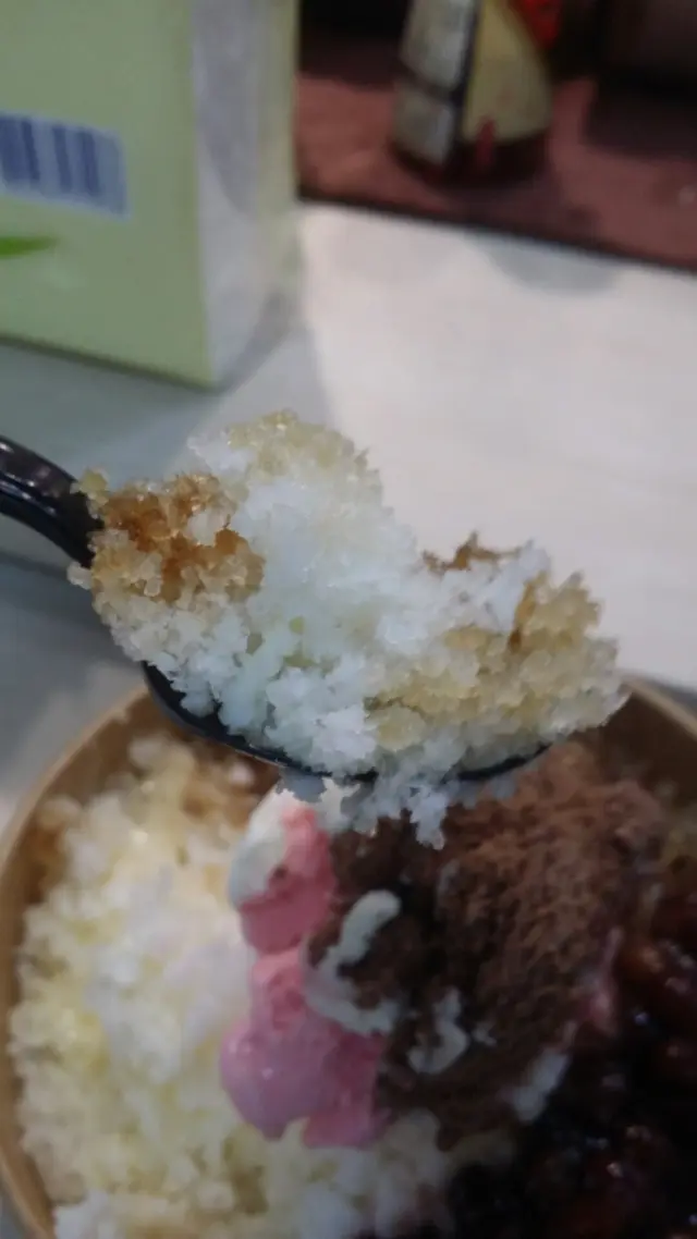 拿着匙羹把「瀧茶」的黑糖冰底,跟煉奶冰底兩種甜味刨冰都一起刮上來,就立刻吃到黑糖跟煉奶兩種甜味混合合成出來的甜味效果,仿佛在吃刨冰版本的「黑糖珍珠鮮奶」一樣。