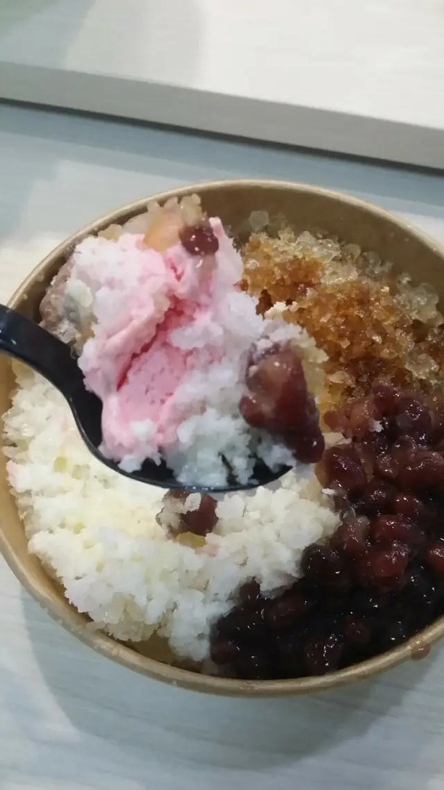 而且「瀧茶」「黑白配」刨冰表面,還有一大球「三色雪糕」作襯托,「三色雪糕」配甜味的黑糖煉奶刨冰一起享用,吃到的刨冰甜味雖然會變得有點混亂,但是正正就符合了「車仔麵」東拼西湊出來的複雜味覺效果。