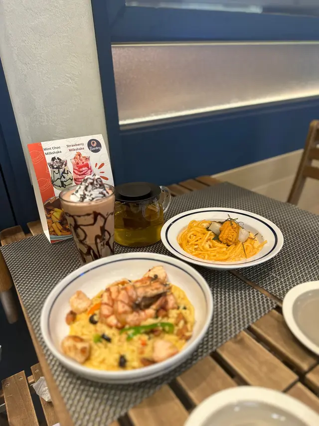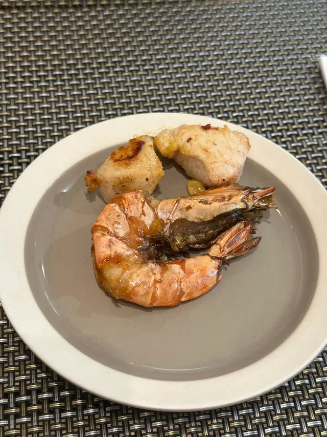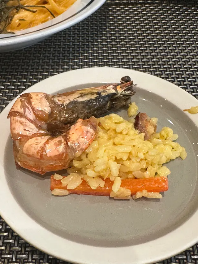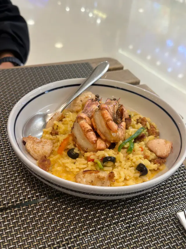 藏紅花的香氣一上桌便撲鼻而來,金黃的意大利飯粒粒分明,吸收了西班牙腸的煙燻油脂與燈籠椒的清甜。黑水欖增添鹹香層次,而燒虎蝦與烤雞肉則是這道菜的靈魂所在——前者鮮甜彈牙,後者肉質嫩滑。整體風味濃郁但不膩