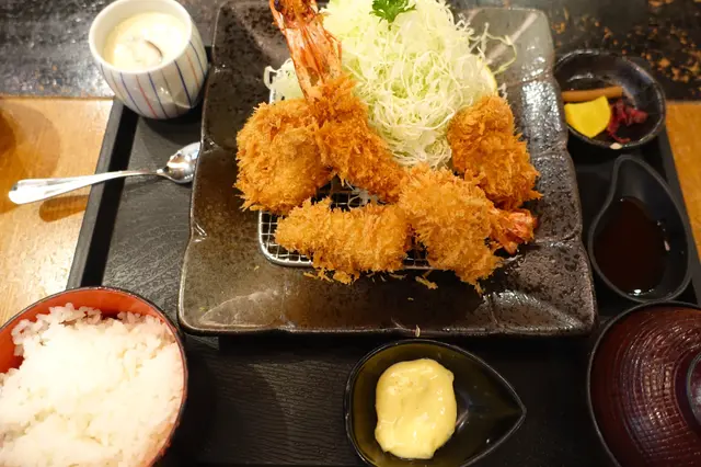 由於下午三四點的關係,我是餐廳唯一的客人,銀座梅林有多款招牌菜式 ,而鎮店之寶非吉列豬扒莫屬,但有少少貪心既關係嗌左個雜錦吉列定食,有大蝦、豬柳、蠔、魚柳(