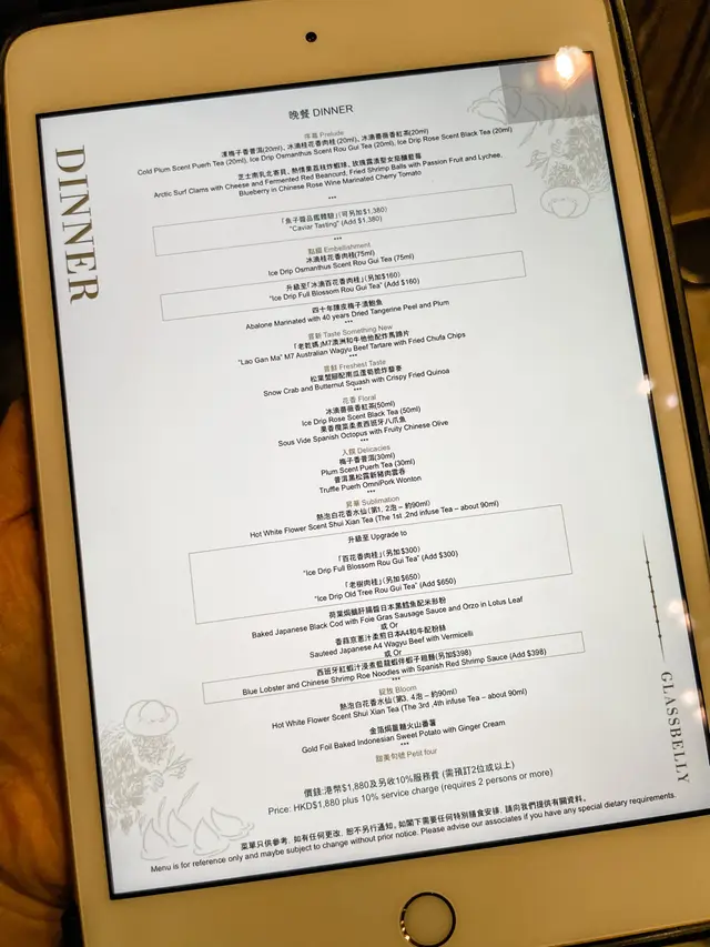 上菜前均會奉上不同品種的茶,配合加入了中、港、法、日等多國元素的菜式,透過味道、香氣、烹調技巧及創意擺盤,呈現港式極致的概念。