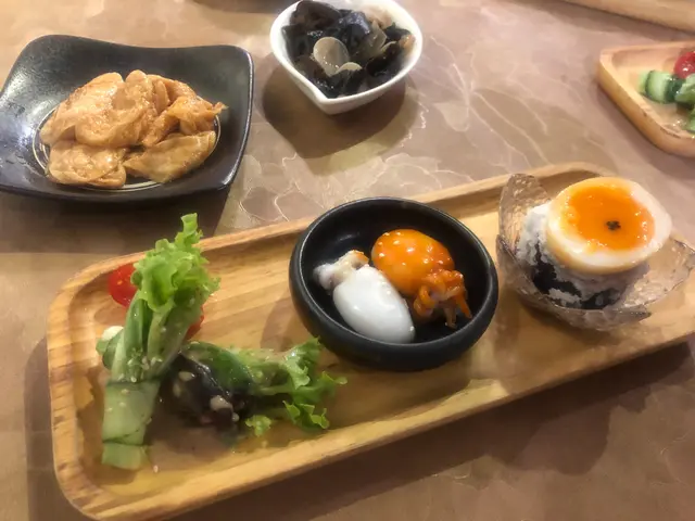 茶燻流心蛋伴墨魚子醬配厚切茄子、