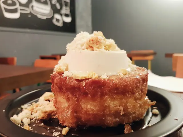 西多很厚的一塊,鬆軟鬆軟的,上面放上厚厚的一大片花生醬雪糕和焦糖脆脆。雪糕很軟滑香濃,不用像平時那樣配上糖漿或煉奶,很特別。好吃是好吃,但還是覺得有點太甜了,最後都淨下了一點