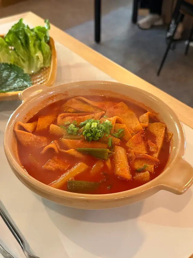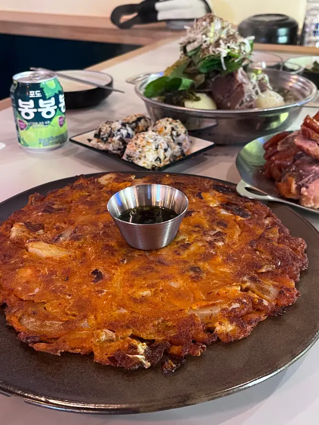 煎餅嘅外圈煎得金黃脆口,直落去會有焦香嘅味道。煎餅中間嘅部份就柔軟得好多,有少少彈性,空氣感十足。裏便嘅魷魚夠足料同埋彈牙,條條都好似手指尾咁粗。泡菜嘅味道微辣得黎又有微酸,越食越惹味。