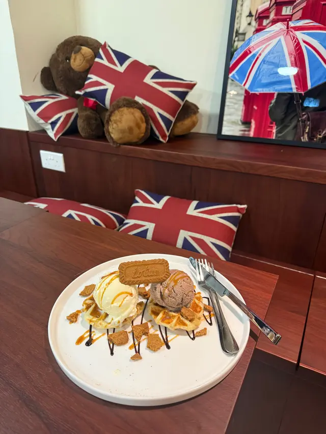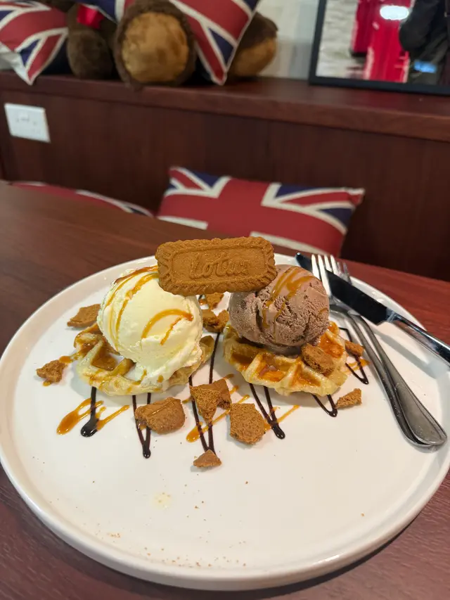 「熱辣辣嘅窩夫格仔餅撞埋冰凍雲呢拿雪糕,一冷一熱超過癮!窩夫邊位脆芯位軟,雪糕慢慢溶化滲落去,仲有朱古力醬同彩虹碎糖,甜到入心!」
