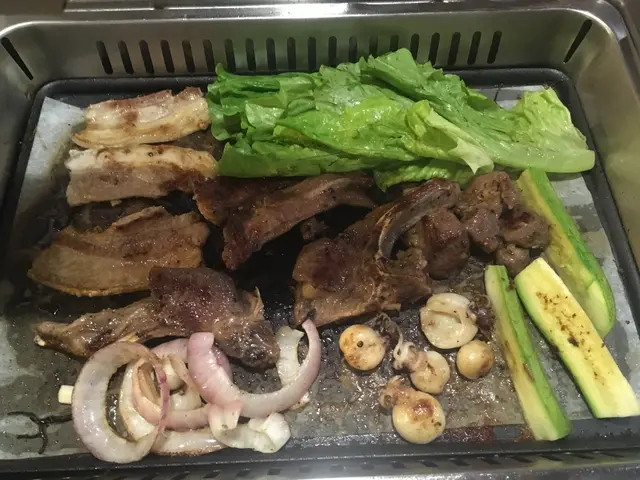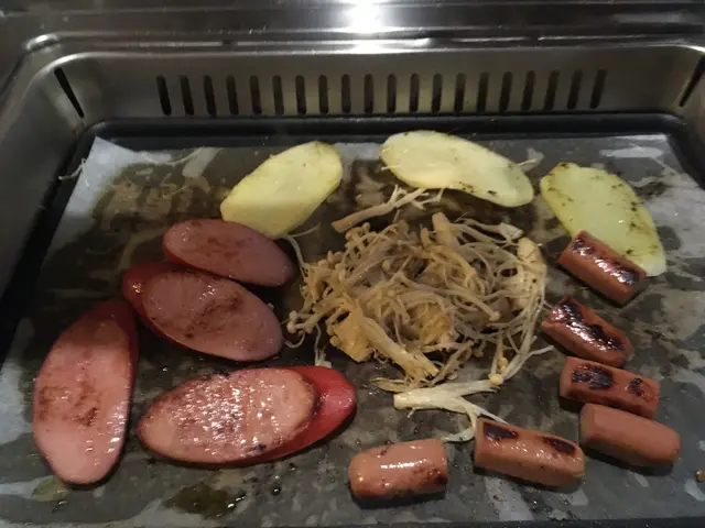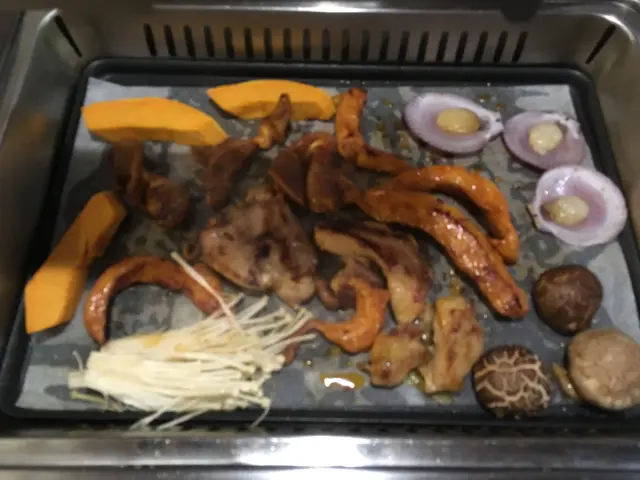 食過刺生後開始烤肉, 先來是豬頸肉, 豬排, 南瓜和一些菇類等等, 烤了一陣食物都熟了, D肉類調味唔錯無需添加醬料已經啱啱好, 唔會過鹹和過淡, 肉質又唔太冧, 最後我們又烤了羊架入口帶小小羊膻味, 都唔錯; 紅洋蔥烤起來有陣陣惹人的香氣, 而且食落帶甜。