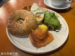 車仔麵吃得多,第一次吃「車仔包」,點了「車仔包」最受歡迎的組合,即貝果($30)加忌廉芝士($10)配煙三文魚和牛油果($58)。