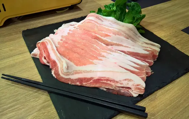 而黑豚肉的脂肪量,相比安格斯牛肉便多很多,驟眼看一半的黑豚肉皆是由白色的脂肪所組成,不過仔細看的話也看到粉嫩誘人的黑豚肉,肉質與脂肪分明,不難看出黑豚肉質素上乘;