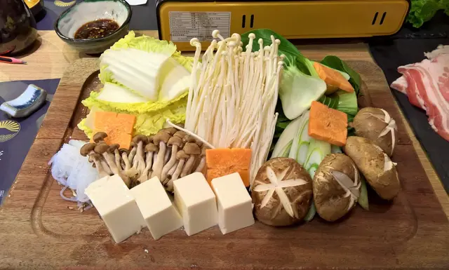 大家可以看看這盤蔬菜,分量實在是令Step和娘子嚇了一跳;當中有大白菜、白菜芯、金菇、冬菇、磨菇、芋絲、豆腐、日本大蔥,紅蘿蔔片等,應有盡有,又可以品嘗牛肉豚肉,又有各式新鮮蔬菜,怪不知深受朋友和她的相公喜愛呢?!