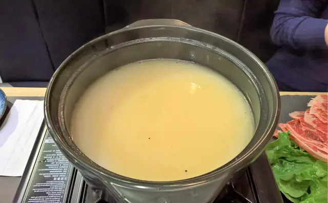 不消一會,waiter送來了一個火爐與一個大瓷煲,當中放了豬骨濃湯,湯色呈奶白色,加熱中不斷散發出豬骨濃湯的味道,令人未食已經不斷唾涎,Step正正坐在濃湯前面,害得Step口水狂嚥呢