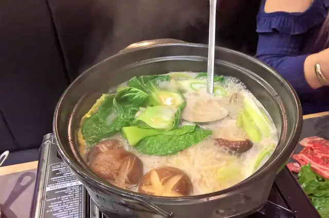 事不宜遲,立即起動;Step毫不客氣先將安格斯生牛肉放在湯中灼燙,大約10秒左右後拿起,蘸上一點醬油後放在口中品嚐,首先牛肉肉香味不俗,雖然是雪花牛但肉質還是纖維感稍強富嚼勁,完全是安格斯牛肉的特色;咀嚼時味蕾有點奇妙的感覺,牛肉中除了有牛肉味的肉汁浸出來外,還有豬骨濃湯的味道,實在是非常特別,不過濃郁鮮甜的豬骨濃湯令牛肉變得更為鮮味可口,令人停不了口吃完一片又一片