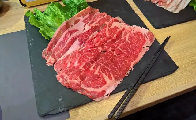 先看看安格斯牛肉,每片除了有著不俗的鮮紅色外,當中還夾雜著不少紋理整齊的雪花紋;幸好脂肪比例不多,只有牛肉邊的部份有多一點脂肪來增加肉汁與口感;