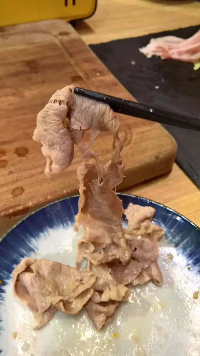 首先,安格斯牛肉與黑豚肉,每碟足足有9-10片,每片的長度足足有一支筷子般長,闊度也有吋半左右,而最重要的是每片皆是有一定厚度(約為2mm),用筷子夾起也不能透光的,令Step已經幻想到熟後的牛肉與豚肉一定是啖啖肉又有咀嚼感