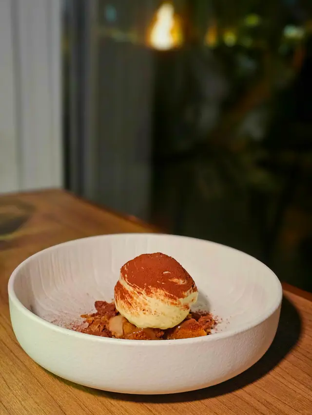 甜點是香蕉拖肥(Banoffee),裡面有香蕉醬、新巧克力脆片和糖霜胡桃,底層還有脆脆餅乾,整體香甜不膩,為這餐畫下完美句號。