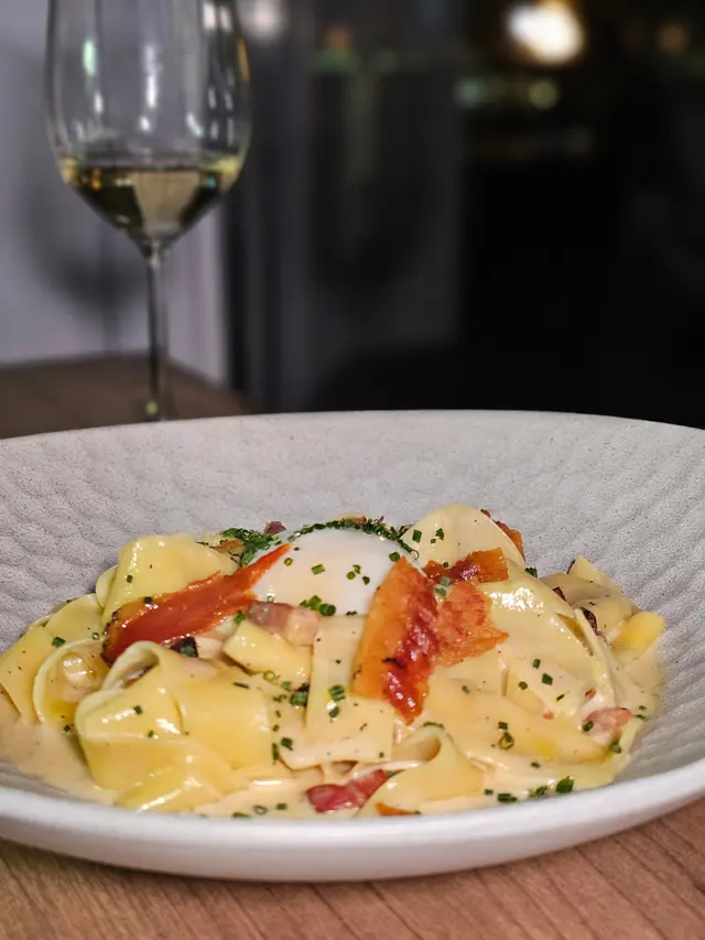 第一道主菜是卡邦尼闊條麵,配料有Guanciale(意式豬面頰肉)、流心蛋和帕瑪森芝士,味道濃郁香醇。