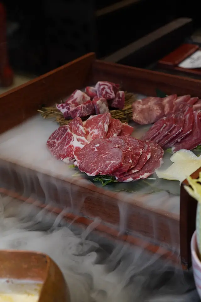 有七款唔同嘅牛肉,手切牛崩沙,本地牛肉,新鮮牛腱,頂級雪花肥牛,牛皇后,牛肉粒,牛舌花,牛魔王必點!有乾冰的霧氣