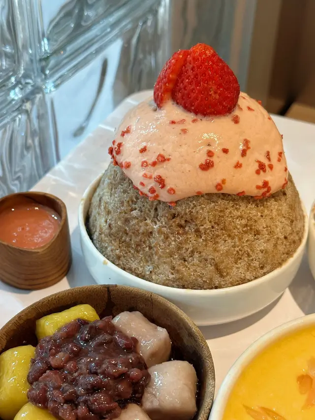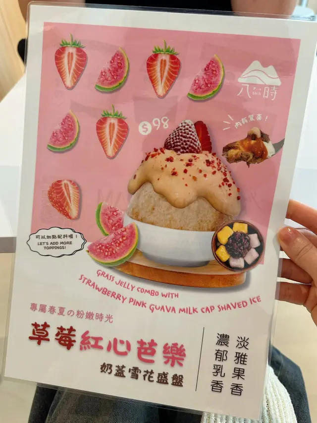 粉嫩草莓+芭乐果肉奶盖铺满仙草雪花冰