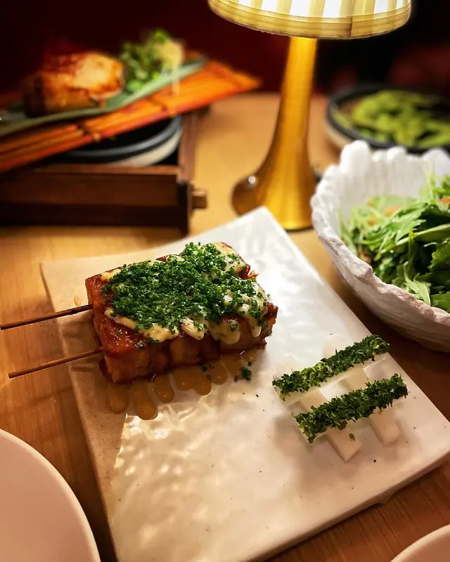 豬腩肉用串燒嘅方式串起,肉質好鬆軟,入口即化~配上蜜糖柚子醬同醃製蘿蔔,一啲都唔覺得油膩😋😋