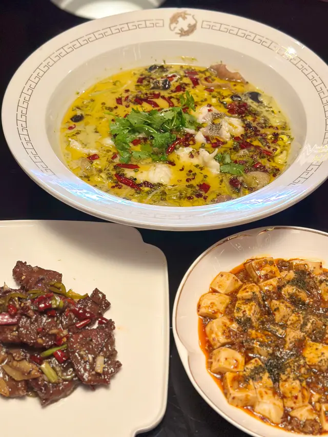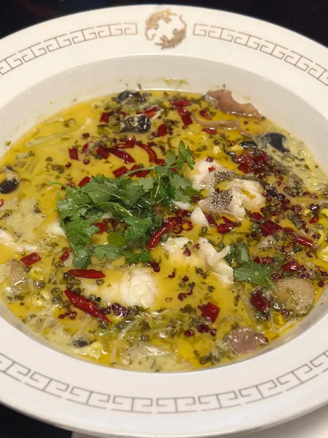酸菜魚 : 傳統川式酸菜魚加入大量花椒及木耳,麻味十足,用上上等石斑肉,肉質鮮嫩,口感滑溜