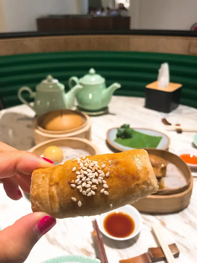 香菇鵝肝醬🦢春卷 (HKD 48): 春卷炸至金黃色,一咬開,竟然先用上等紫椰菜花和鵝肝,啖啖鵝肝清香,蝦🦐燈提出鮮味,好特別🥢