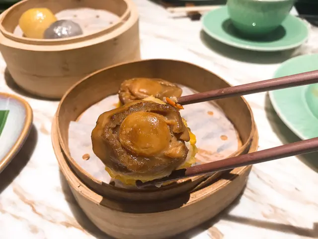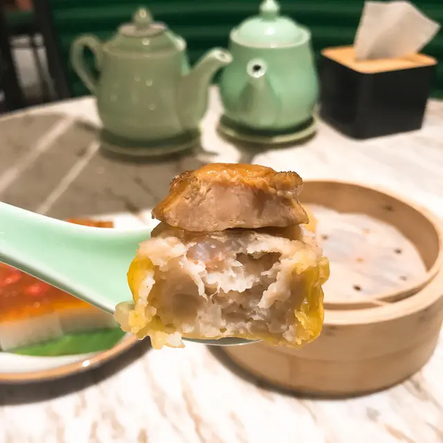 原隻鮑魚燒賣皇 (HKD 108): 一口豪華的鮑魚,鮮味十足,下面的燒賣有很重的豬肉🐖味之餘也沒有重口的脂肪感,想必是肥瘦肉的比例上瘦肉比較多。當然中間的冬菇也能增加一些菇香味,肉質比較扎實,爽口和鮮味兩者兼得,讚👍🏽