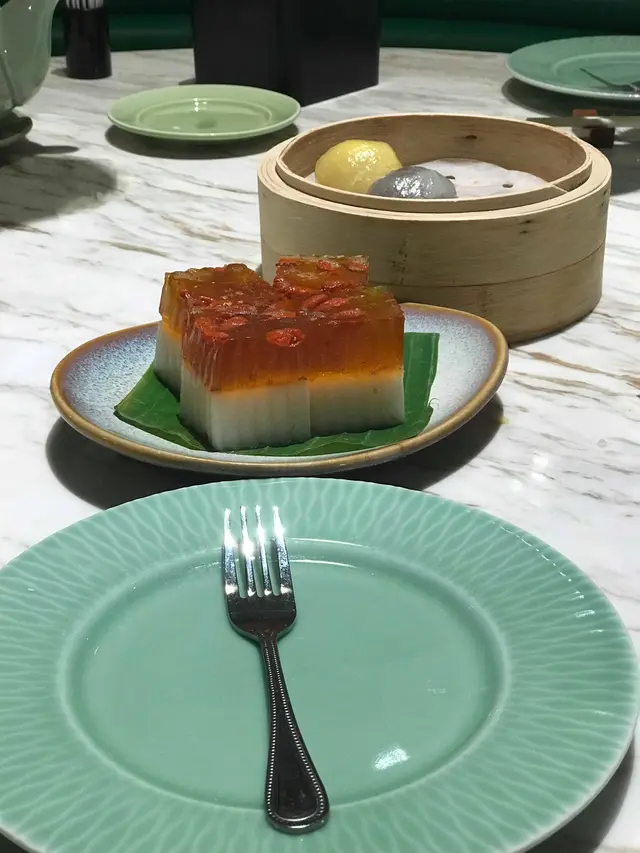 鴛鴦水晶包 (HKD 48): 奶黃跟豆沙餡都不太甜💋💋半透明的外皮質感柔軟,而且比較厚,像粉果的皮,吃起來煙煙韌韌,當作甜點不錯吃🙂