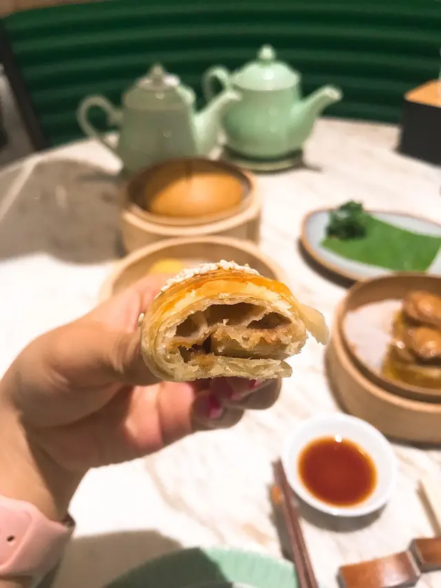 遠年陳皮叉燒酥 (HKD 48) : 金黃色的酥皮,香氣四溢,表面上刷了一層楓糖漿,少許芝麻,黃金酥脆的樣子很誘人😍。一咬開誰想到可以加陳皮在叉燒酥而沒有違和感之餘也有趣的互相輝映著?陳皮具有溫胃散寒、理氣健脾的功效,配上蜜味叉燒,大大減少了酥皮的膩感💋
