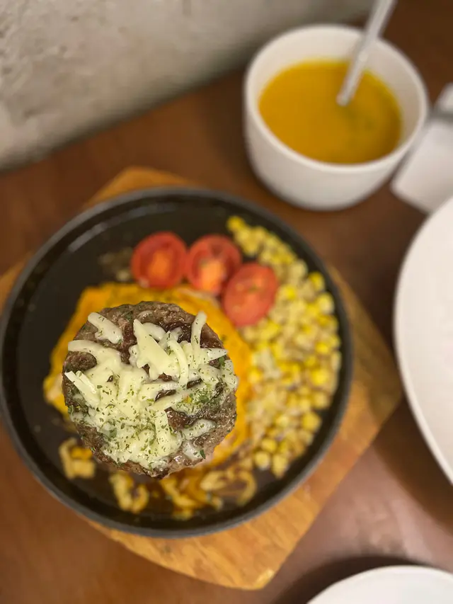漢堡超厚身!而且多汁唔乾!唯一係略有少許筋,但呢個價錢絕對已經係值回票價;滑蛋都幾嫩滑,旋風蛋需要久經訓練,所以都係去餐廳食啦;醬汁方面偏向似燒汁,但又唔會太甜同太稠,唔會膩口;菜式嘅顏色主調係黃色同啡色,另外仲有一粒紅色番茄仔作點綴,加返少少綠色蔬菜嘅話會更吸引。