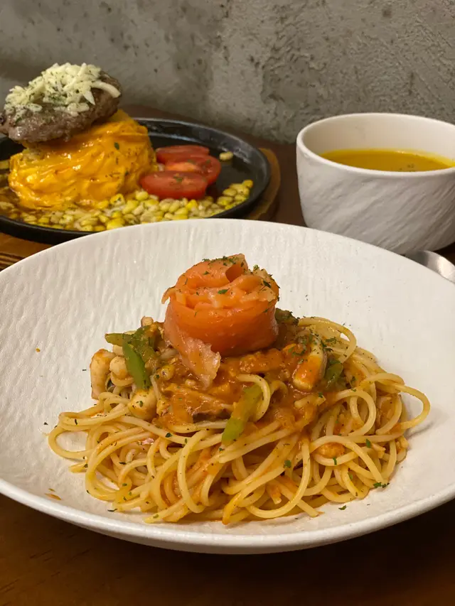 🌗韓式辣汁海鮮意粉配煙三文魚 $68