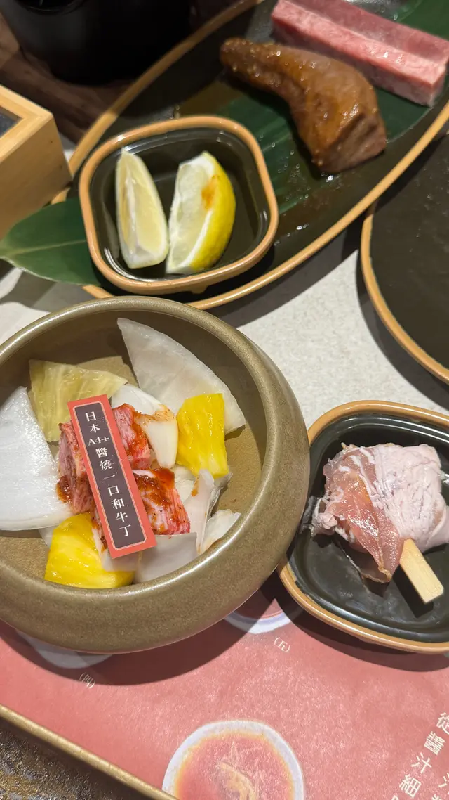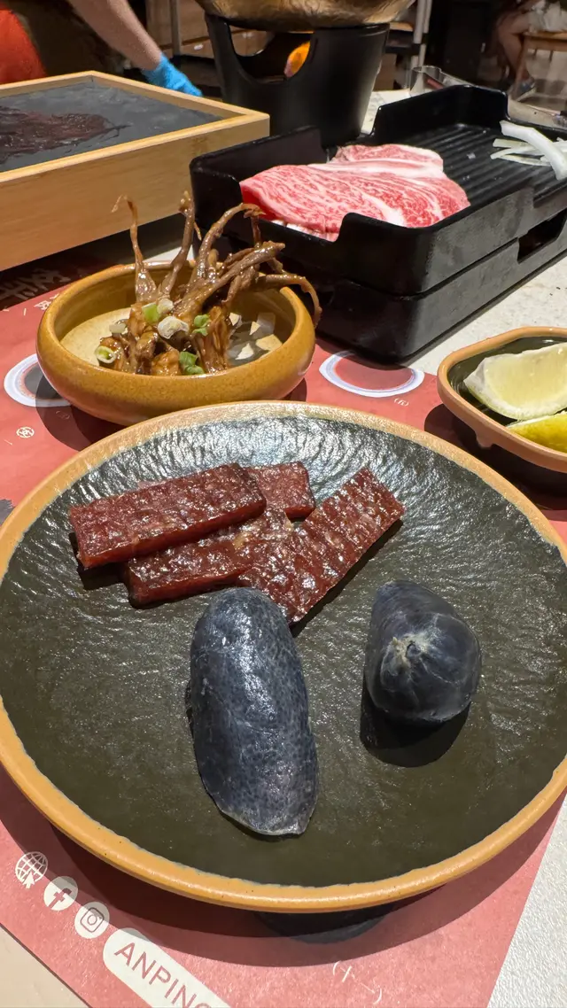 日本A4+和牛花紋分佈平均,肉味濃郁,除此之外,仲可以任食日本A4+和牛壽喜燒,有一個細細嘅爐,火候唔算大,將啲和牛放入個鍋度,等佢慢慢煮熟。厚切檸檬牛舌嘅肉質爽口。蘭王蛋月見牛,攪勻個蛋黃後再燒,味道都唔錯👍🏻飲啤酒🍻唔少得下酒菜,台灣直送嘅西門町香烤鴨舌,蜜烤豬肉乾、黑金墨魚香腸、火烤魚干佐蛋黃醬。
