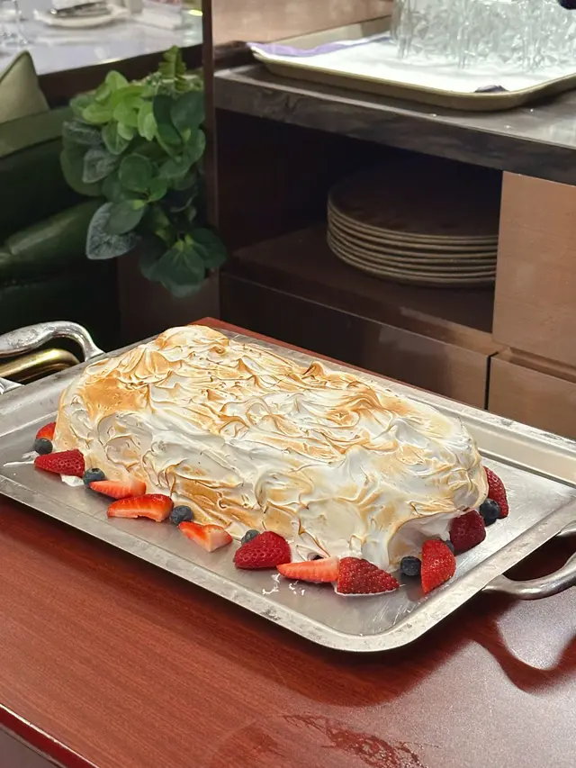 🔔第二場(火焰雪山):完美做到色香味俱全表演,蛋糕表面鋪滿蛋白霜,用火係表面燃燒後,燒出濃烈酒香味,入面係雲呢拿味雪糕蛋糕,低層望落似朱古力蛋糕但食落有濃烈酒味,中間夾雜住冰鎮生果好特別💖