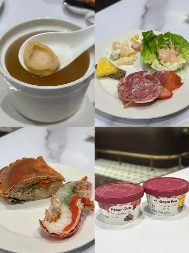 ♦️甜品🍨:款式多到食唔晒,泡芙塔打卡之餘外層加左糖漿超脆口,記住要食埋兩款得獎甜品藍芝士撻同朱古力蜜柑慕絲蛋糕,前者芝士香味濃郁,後者蛋糕中間有啖啖蜜柑果肉超滿足🥰另有巴斯克起司蛋糕、西瓜草莓蛋糕、綠茶歌劇蛋糕、蒙布朗、牛油麵包布丁,仲有即叫即製窩夫配埋Häagen-Dazs雪糕絕配,雪糕有咖啡味、曲奇味、士多啤梨味、朱古力可以揀😍