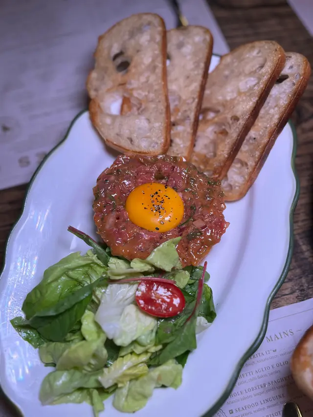 這道生牛肉他他使用手切的USDA菲力牛肉,質地鮮嫩,搭配生雞蛋和酸種麵包,吃下去鮮甜的滋味瞬間爆發。🥩這道菜對於喜愛生牛肉他他的食客來說,簡直是不能錯過的美味,超有誠意!