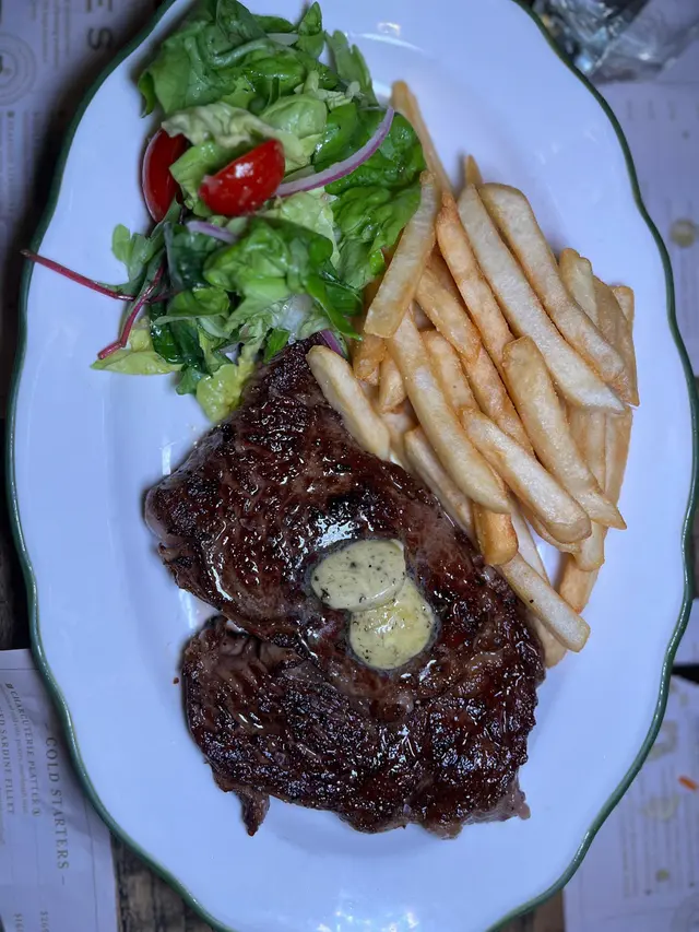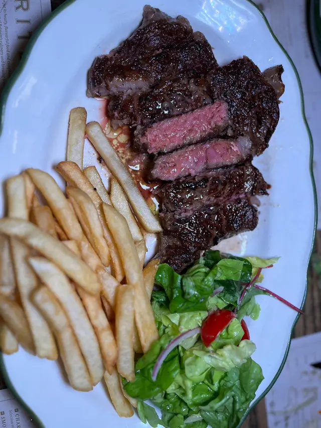 選擇了400克的肉眼牛扒,搭配香脆的薯條和新鮮沙律,牛扒切開後粉嫩的肉色令人垂涎,肉質鮮嫩多汁,油花分布均勻,口感非常豐富。🥩這道經典的牛扒薯條絕對值得推薦,肉味濃郁,讓人一口接一口!