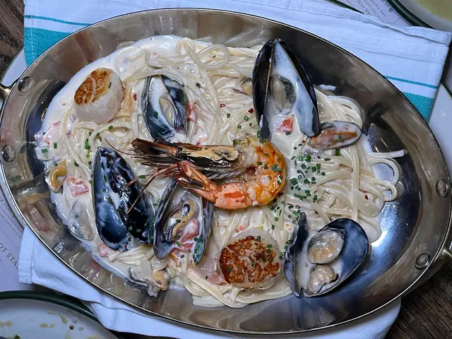 這碟海鮮扁意粉的份量十足,鋪滿了虎蝦、帶子和青口等海鮮,搭配白酒忌廉汁,口感滑溜且鮮味無窮。🍝這道菜的海鮮新鮮,絕對是海鮮愛好者的最愛!