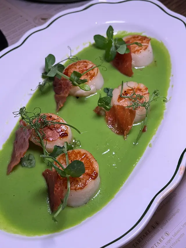 香煎帶子擺盤精美,底部鋪有豆香的豌豆泥,帶子外層焦香,內裡卻保持著柔軟的口感。🍽️帶子的鮮甜與香脆的Parma Ham相得益彰,鹹香味道十分匹配,讓這道菜帶來了意想不到的驚喜!